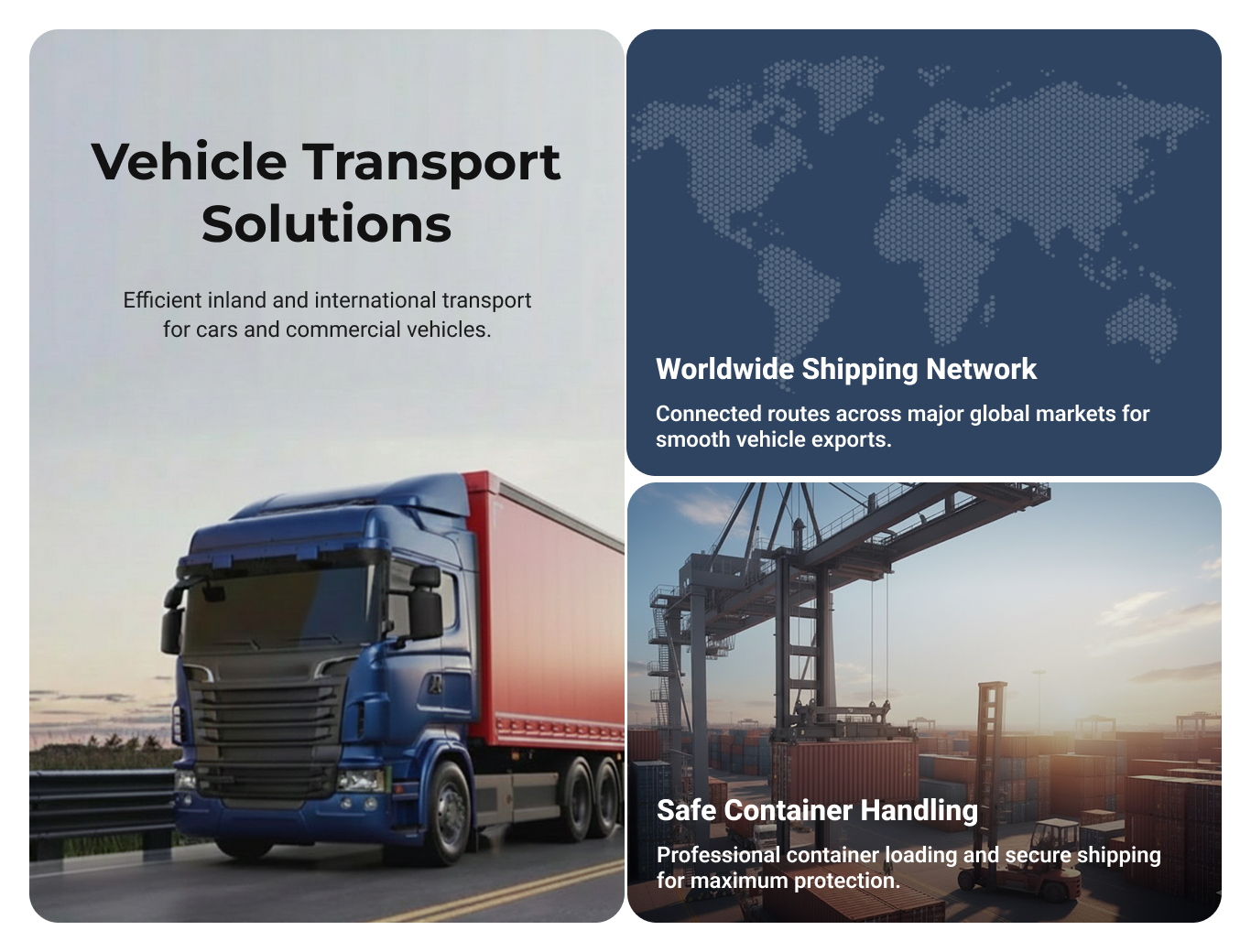Empowering Car Manufacturers, Car Dealerships, Car Dealers and Individuals with efficient, transparent, and secure shipping solutions — from vehicles to heavy cargo, we deliver with precision and care.